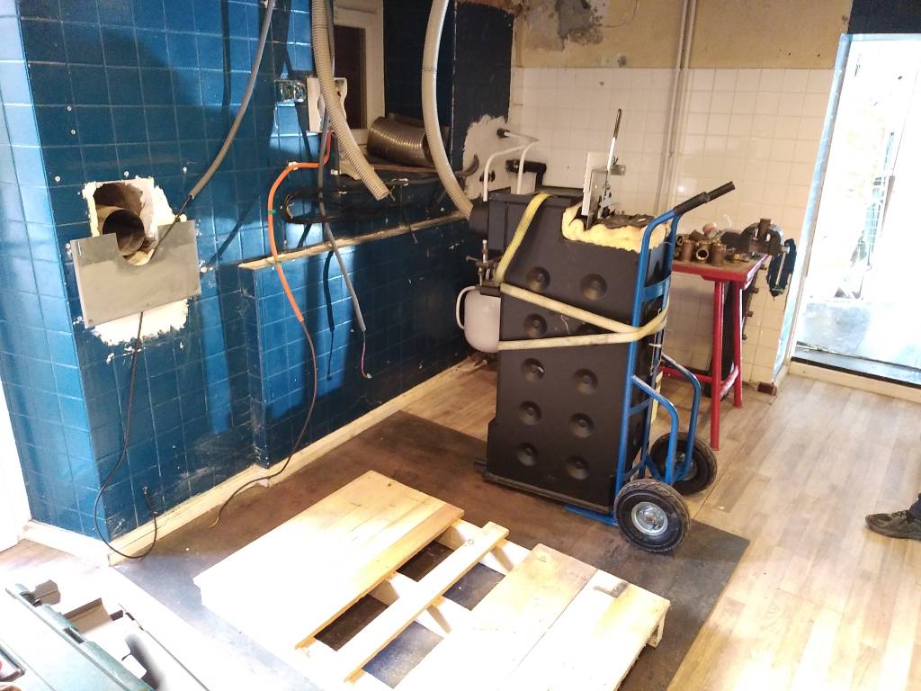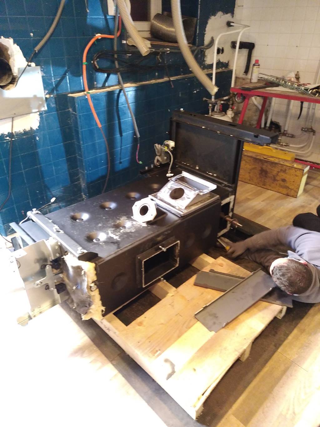 Seul problème : l'accès au local où avait été implanté la chaudière à l'origine était trop étroit pour faire rentrer la chaudière entière vu ses dimensions et son poids. Après avoir démonté l'ancienne chaudière pour la sortir du local en pièces détachées, il a donc fallu démonter complètement la chaudière neuve pour pourvoir introduire les différentes parties, une à une, dans le local et tout réassembler ensuite. Le démontage est une chose à la portée de beaucoup de monde mais le remontage correct demande une bonne connaissance de la conception de la chaudière et bien sur pas mal de temps...