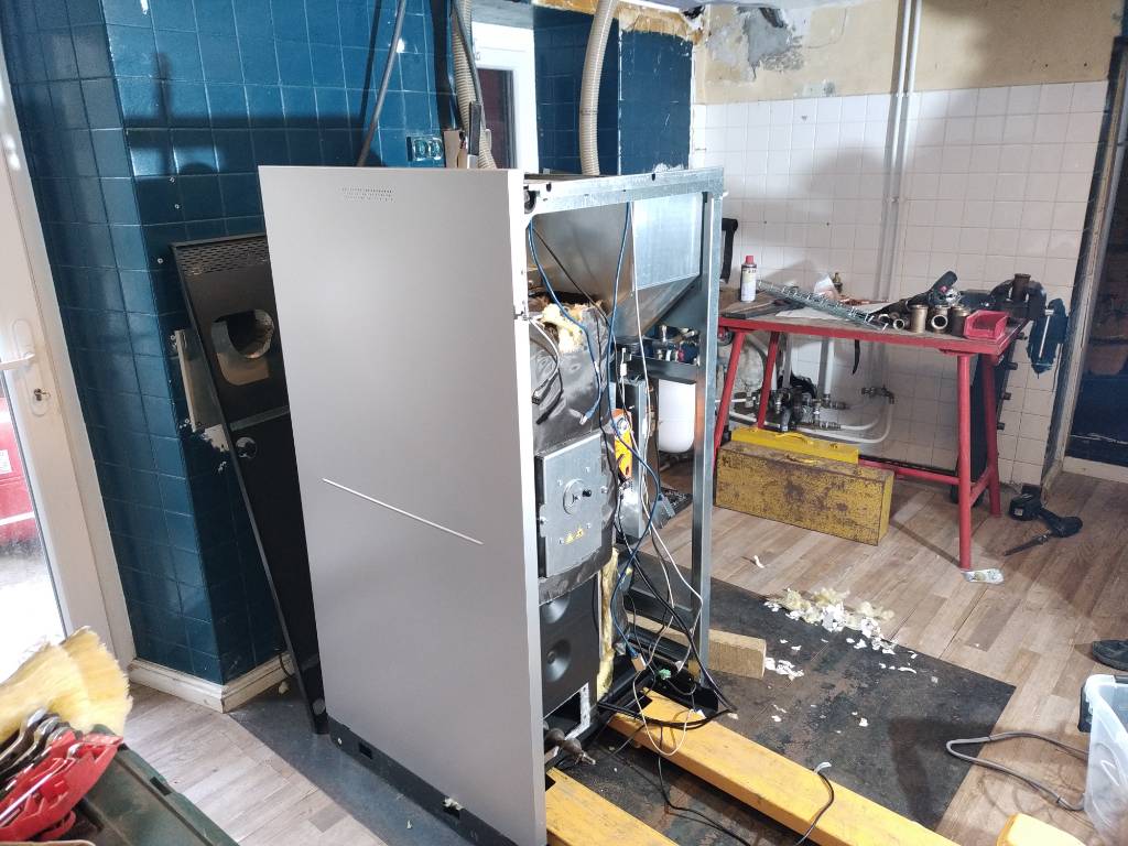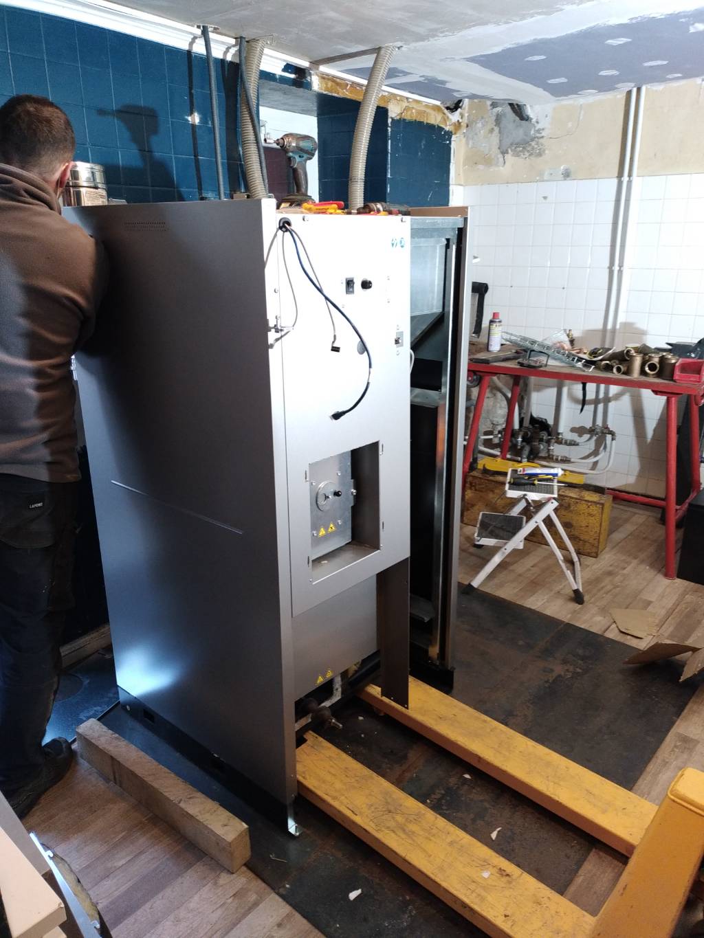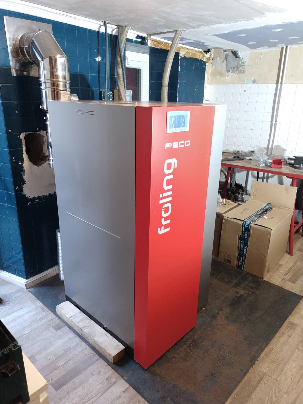 Pour une personne victime d'une arnaque par une entreprise ayant réalisé une installation de mauvaise qualité, mal conçue avec une chaudière bas de gamme peu fiable et qui ne fonctionnait donc pas malgré le prix facturé, nous avons enlevé la chaudière en place pour la remplacer par une chaudière à granulés Froling PECO 35kW.